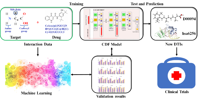 药物发现是识别具有潜在治疗作用的新候选化合物的过程,药物-靶标相互作用(DTI)的识别和预测可以帮助理解药物作用机制,辅助新药发现或将现有药物用于新的疾病类型或靶标。实验方法鉴定DTI既耗时又耗费资源,通过计算方法预测DTI将大幅提升研究效率。在过去的十多年中,已有许多用于预测DTI的计算方法,但仍存在精度低、假阳性高等问题。为此,魏冬青课题组长期钻研于生物信息学、人工智能辅助药物设计等领域的方法学研究。前期研究工作中,该课题组开发了基于网络标签空间划分方法,将一个多标签多分类问题转化为多个单标签多分类器的集成算法,该算法考虑了类标签之间的相关性,优于传统的多分类学习算法,并首次应用于药物代谢领域(//doi.org/10.1021/acs.jcim.9b00749)。另一方面,成功发展了深度级联森林的人工智能方法(DTI-CDF),可在小样本量数据的情况下获得性能媲美甚至优于深度学习的结果(//doi.org/10.1093/bib/bbaa104 )。