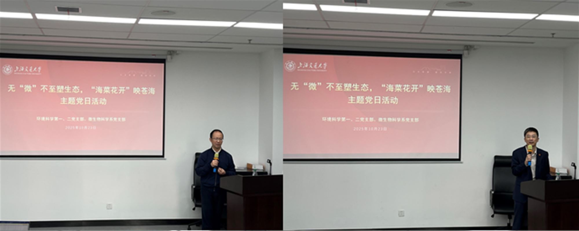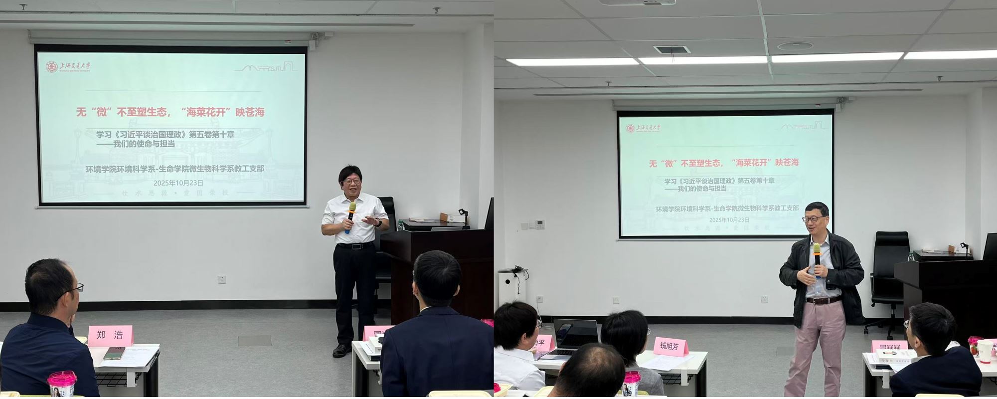 2025年10月23日中午,生命科学技术学院微生物科学系教工党支部与环境科学与工程学院环境科学第一、第二支部联合开展主题党日共建活动。环境学院党委书记郑浩,副院长赵砚彬,教工党支部支部书记钱旭芳、张岳、张波,生命科学技术学院党委书记冒巍巍、副书记王鑫、微生物科学系主任周宁一、支部书记徐俊以及60多位党员参加活动。本次活动以“无‘微’不至塑生态,‘海菜花开’映苍海”为主题,旨在推动科研领域的交叉融合,共同为我国的生态文明建设贡献智慧与力量。