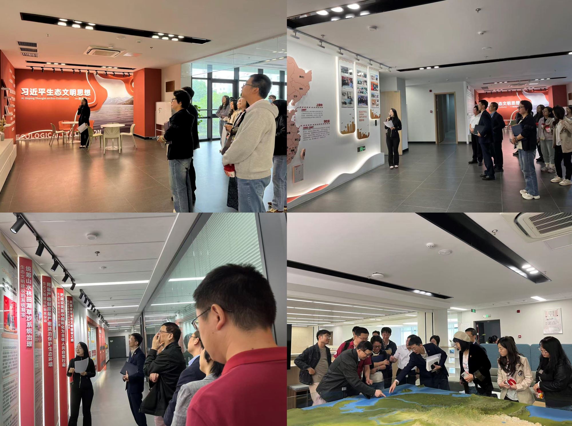 会后,在讲解员的引导下参观了环境学院“习近平生态文明思想”微展馆。在祖国大好河山的沙盘下驻足凝视, 用心领悟总书记提出的“绿水青山就是金山银山”、“统筹山水林田湖草系统治理”和“全方位、全地域、全过程开展生态文明建设”的现实意义。