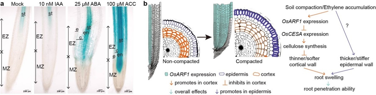 那么,是谁在调控纤维素合成的速度,以维持对植物生长的最有利条件呢?研究团队从上千个水稻基因中找到了关键调控因子OsARF1。当根系遇到板结土壤时,土壤中积累的气体激素乙烯会激活OsARF1,使其从根系中心扩散到皮层细胞,抑制纤维素合成酶基因的表达,最终导致皮层细胞壁变薄变软,根系得以径向膨胀变粗。并通过进一步实验验证,发现缺失OsARF1的突变体根系纤细、无法膨胀;过量表达OsARF1的植株根系粗壮、穿透力强。以上证明了乙烯-OsARF1-纤维素合成酶这条调控链路,正是植物应对土壤板结的关键策略。