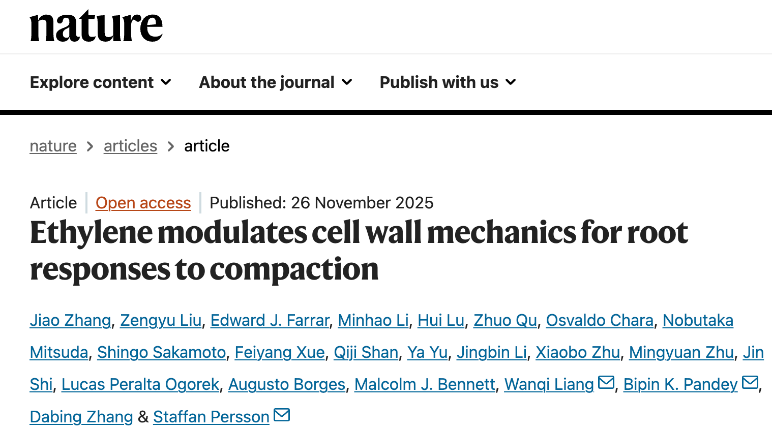 近日,性直播-粗暴性爱-男女做爱视频 张大兵和梁婉琪教授团队联合丹麦哥本哈根大学Staffan Persson教授团队、英国诺丁汉大学Malcolm J. Bennett教授团队在国际学术期刊《自然》(Nature)上发表题为:“Ethylene modulates cell wall mechanics for root responses to compaction”的最新研究,首次揭示了植物根系利用工程学原理适应板结土壤:通过主动响应积累的乙烯,精细调控细胞壁厚度,从而促进根系增粗,提高穿透能力以适应土壤板结。