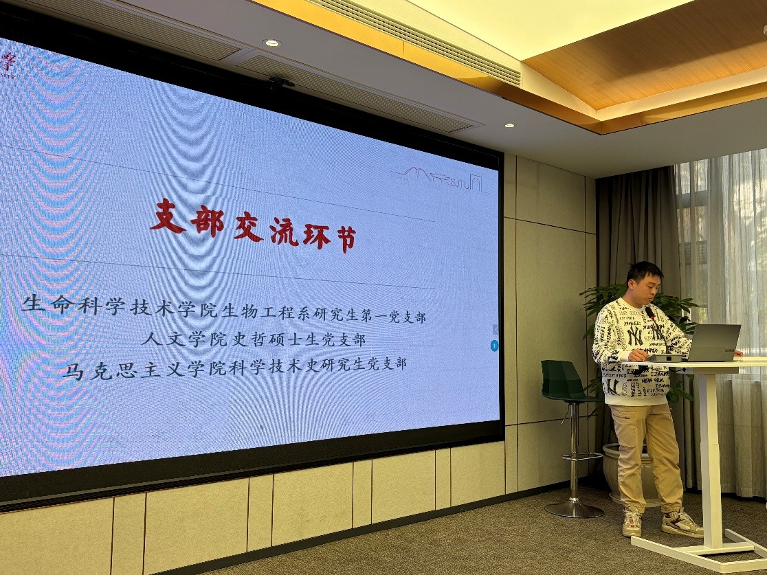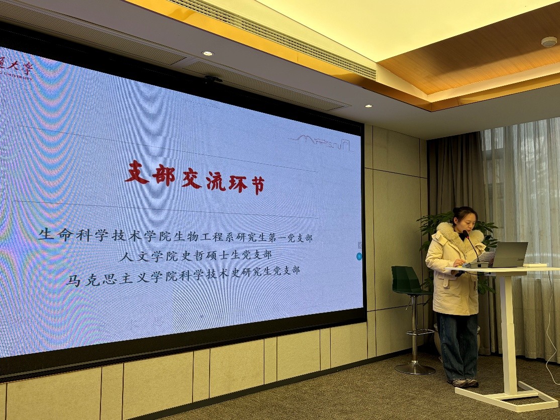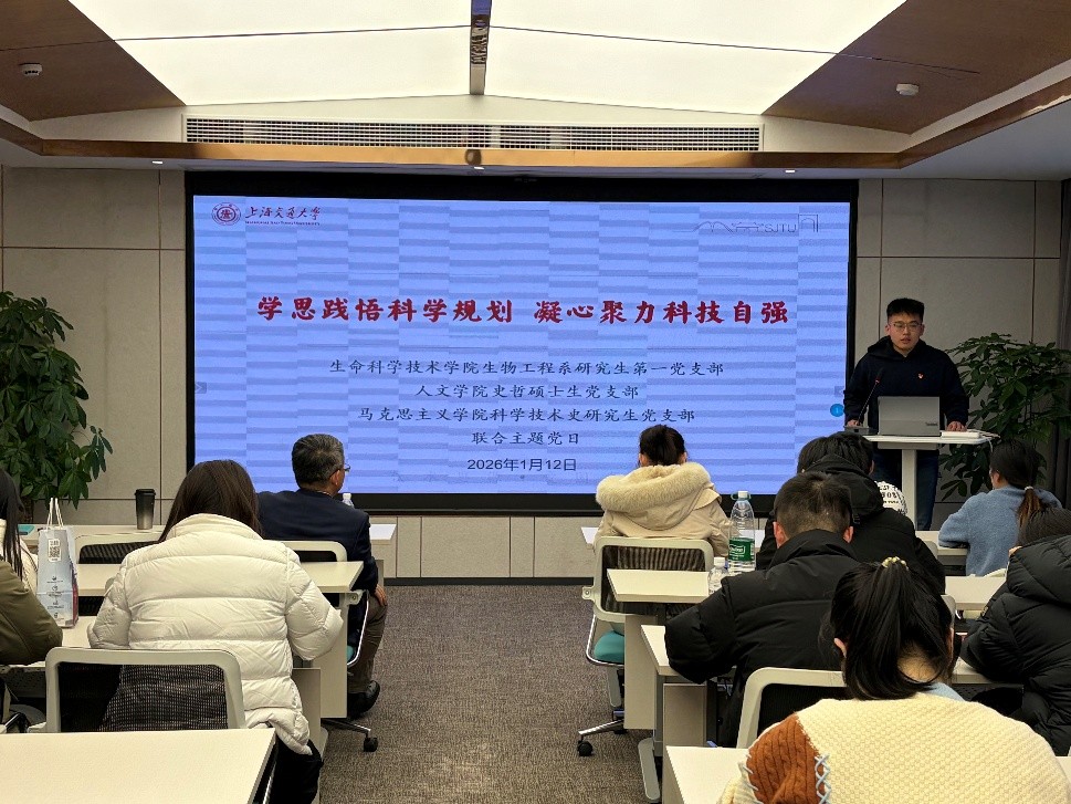2026年1月12日下午,生命科学技术学院生物工程系研究生第一党支部、人文学院史哲硕士生党支部、马克思主义学院科学技术史研究生党支部在人文学院联合开展主题共建活动。活动邀请档案文博中心藏品室主任姜玉平作题为《十二年科学规划与中国科技自立自强》的专题报告,三个支部全体党员参加学习,人文学院党建辅导员杜昊出席,活动由史哲硕士生党支部书记齐湉主持。