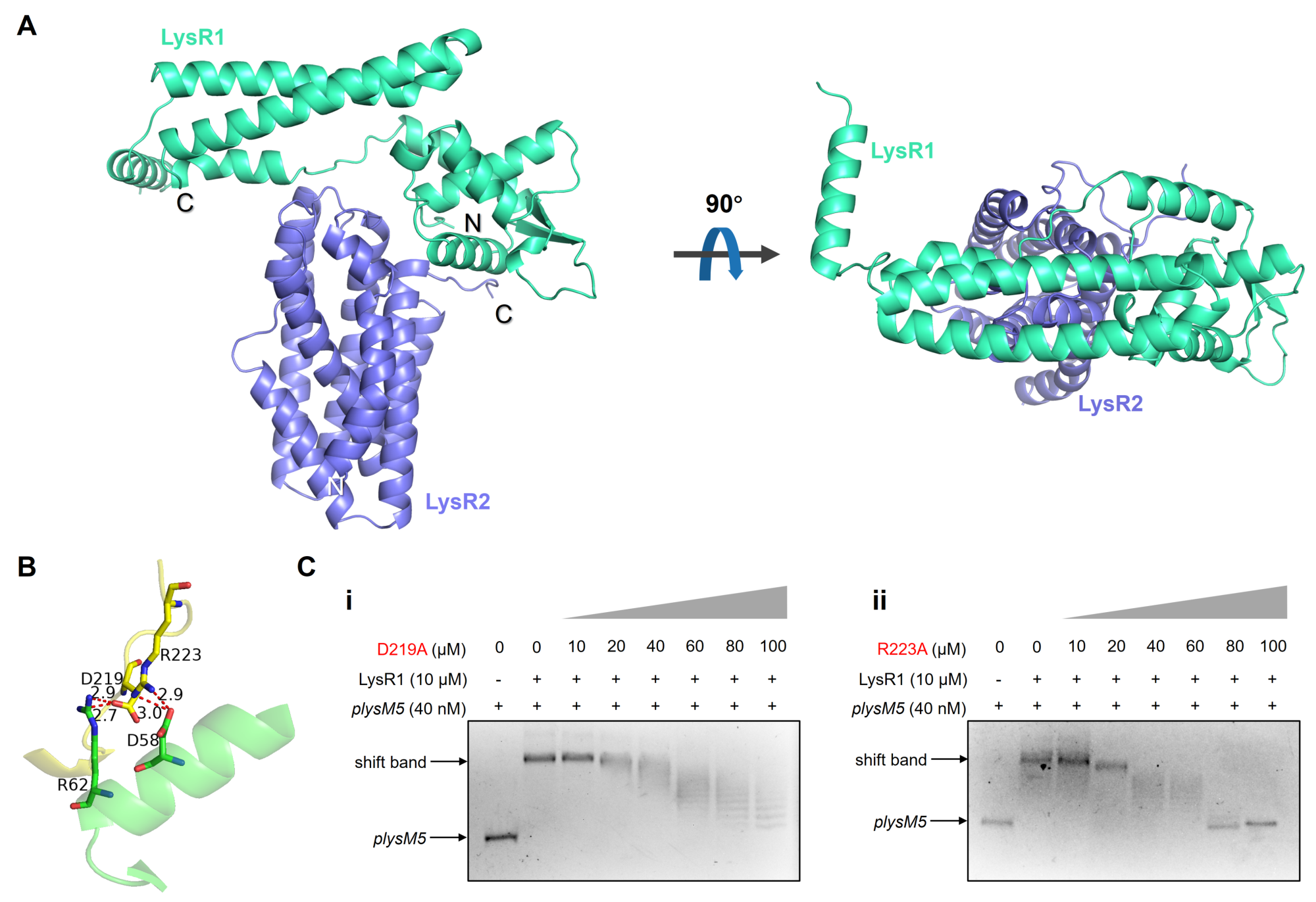 为阐明LysR2与LysR1的互作调控机制,研究团队解析了LysR2蛋白的晶体结构。结果表明二者以1:1比例形成异源二聚体,其中LysR1的α3螺旋与LysR2的C端loop区相互作用。结构分析发现LysR2的C端具有一个电荷极化区域(由酸性残基D104、D219与碱性残基R223组成),可能作为互作界面。该区域与LysR1的α3螺旋上带相反电荷的残基(R62、K63、R55、R59)空间互补,几何构象匹配。进一步的突变实验证实,残基D219与R223对维持两蛋白互作及复合物稳定具有关键作用。微生物天然产物生物合成具有复杂的调控网络,深入解析其调控机制对于指导微生物药物生产具有重要意义。该研究发现了一种全新的抗生素生物合成转录调控模式,丰富了对抗生素生物合成调控的认识,对于指导相关微生物天然产物高产具有重要意义。