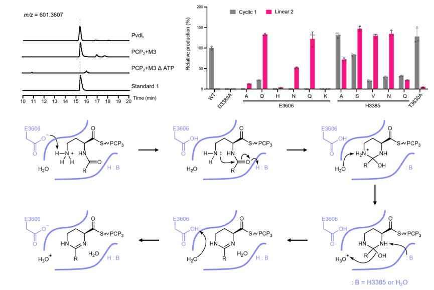 图2. PvdL-C3催化四氢嘧啶环形成的体外验证、突变分析与催化机理模型