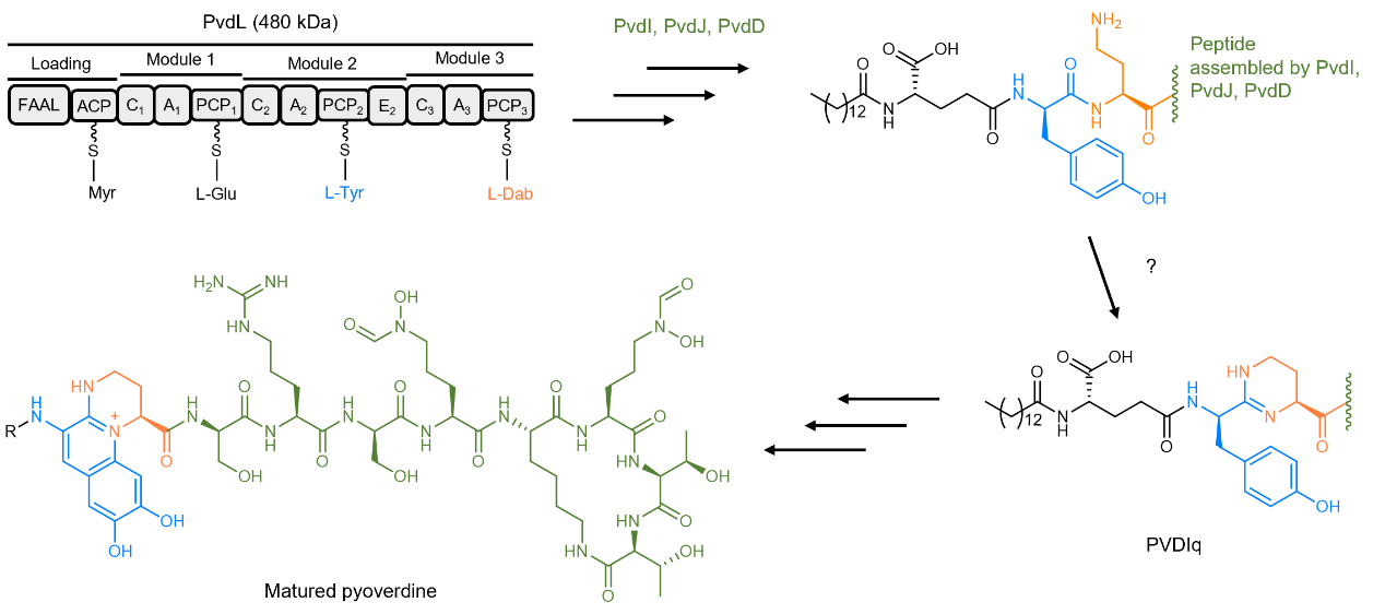 图1. 铜绿假单胞菌Pyoverdine的生物合成途径